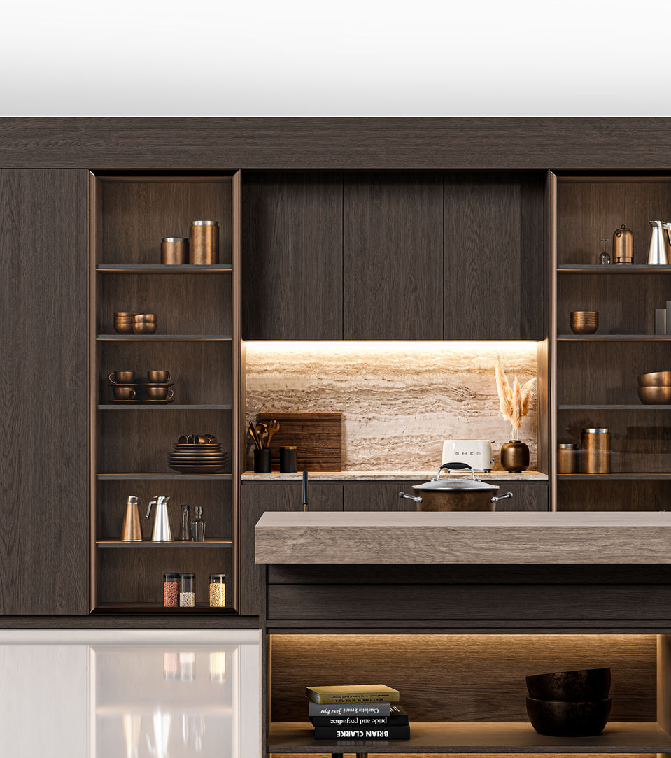 Simplus channels the spirit of functionality and convenience that caters to the changing needs of the home. To recreate this look in your personalized area a combination of 90% solid unit and 10% opened glass unit is highly recommended. Dominating the space, the solid fronts and backing of the glass unit are finished in the same dark walnut veneers, complementing the design through its natural, tactile expression.