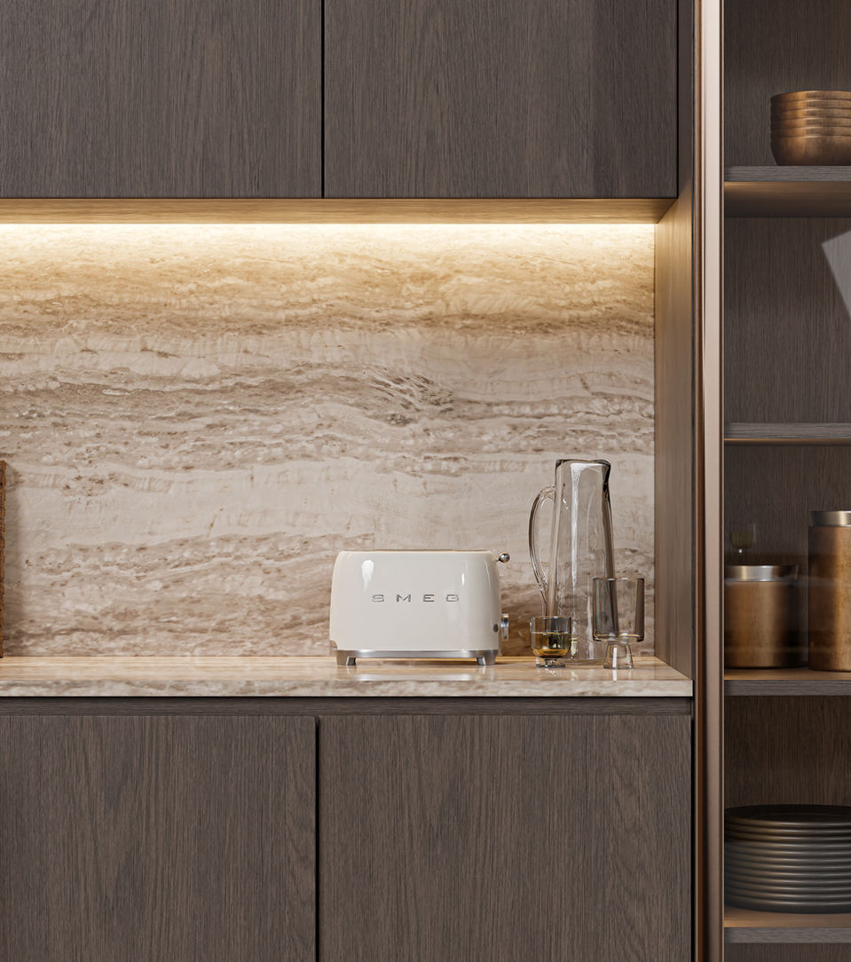 Simplus is a kitchen with a sleek aesthetic looks of its handleness cabinets carved continuously throughout the length of the island. Taking the center stage of the kitchen, the island consists of three uniquely combined materials; Marble, Steel and Solid wood presenting a clean but raw experience.